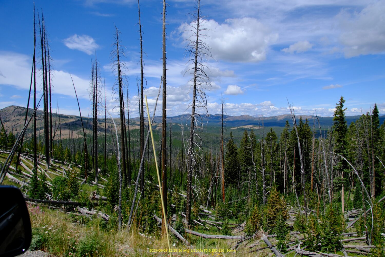 周囲にはこんな燃えた木が。イエローストーンは何度も大規模な山火事を起こしているらしい。国立公園の方針として、自然現象には干渉しないことにしているそうな。なので燃えても燃えっぱなしで消火しないらしい。