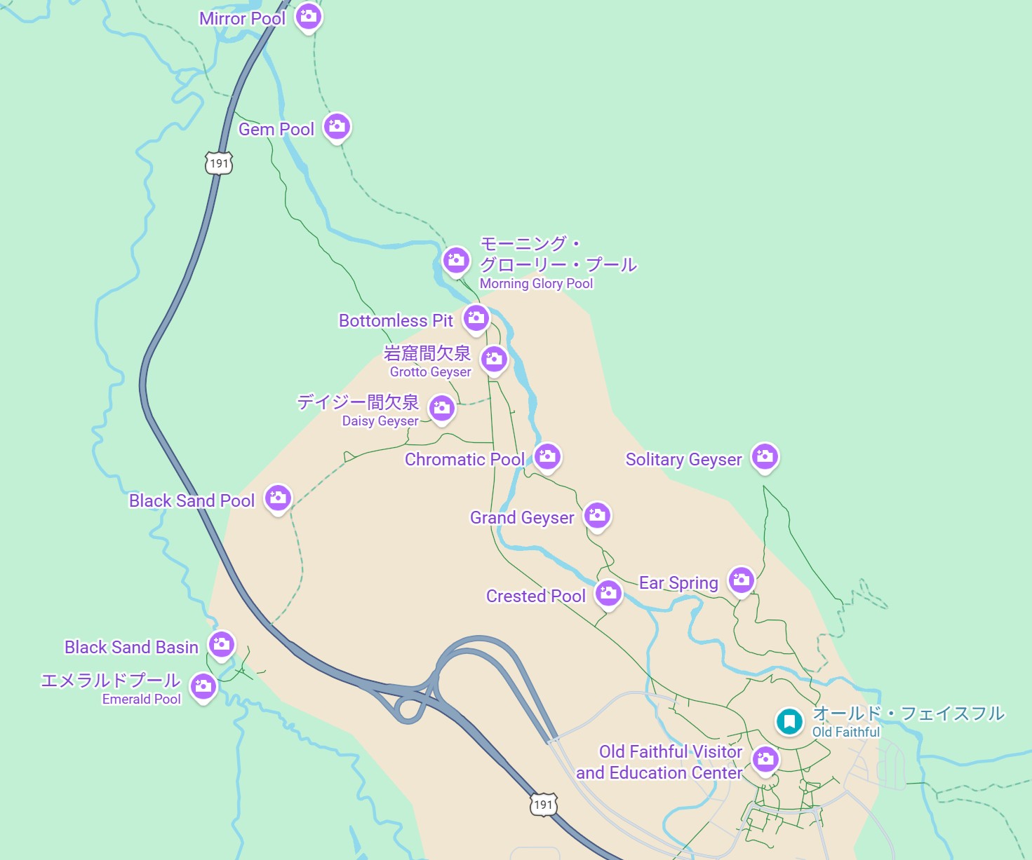 オールドフェイスフルのように噴出するタイプの温泉をガイザーGeyserと呼ぶ。これはキャッスルゲイザー