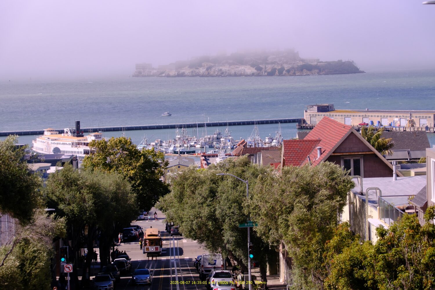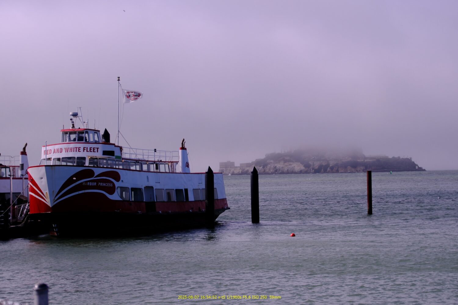 霧に霞んでいるアルカトラズと港めぐりのフェリー