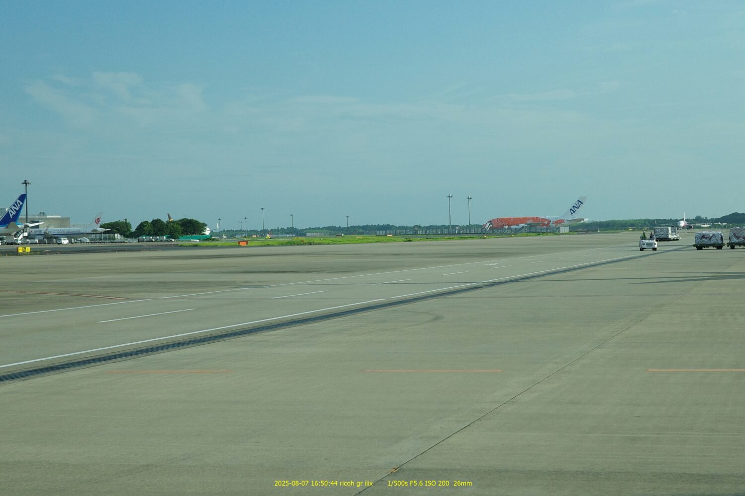 成田着。向こうに見えるオレンジのはウミガメ飛行機。