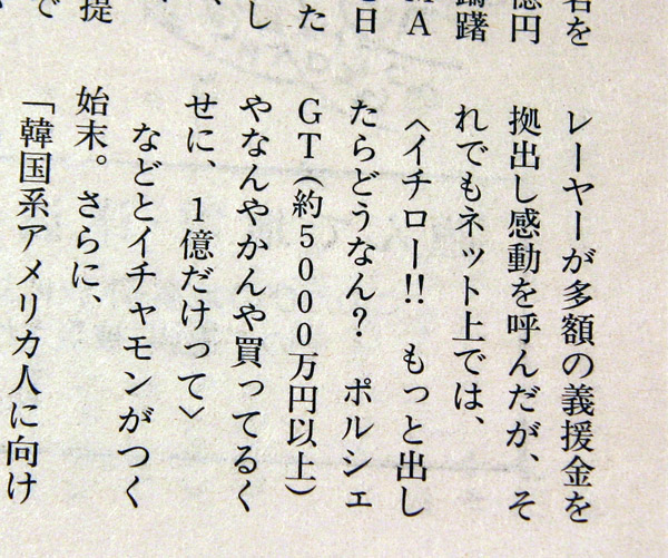 各界有名人の義捐金(義援金ではなくこちらが正しいらしい)の額についての記事である。ちなみにイチローの乗る「ポルシェGT」とはこんな車である(笑)