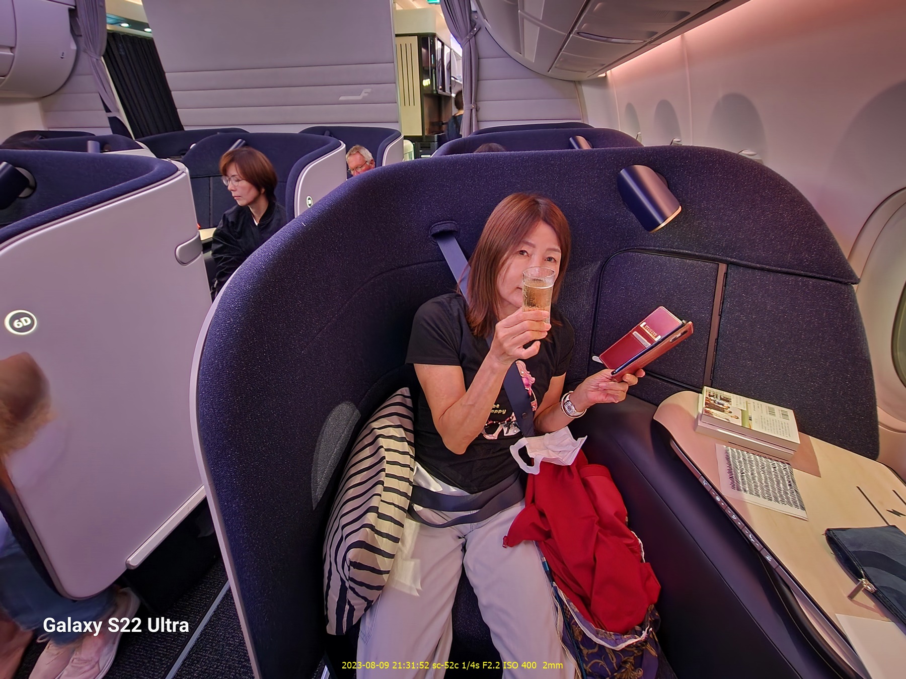 背もたれは固定のままであるが、かなり大きな面積で丸く湾曲しているため「ラウンジソファ」の趣だ。起きているときはダラダラとしたエエ加減なずぼら姿勢を許容してくれるので、まるで自宅でくつろいでいるような状況になる。長距離飛行にはうってつけのシートである。