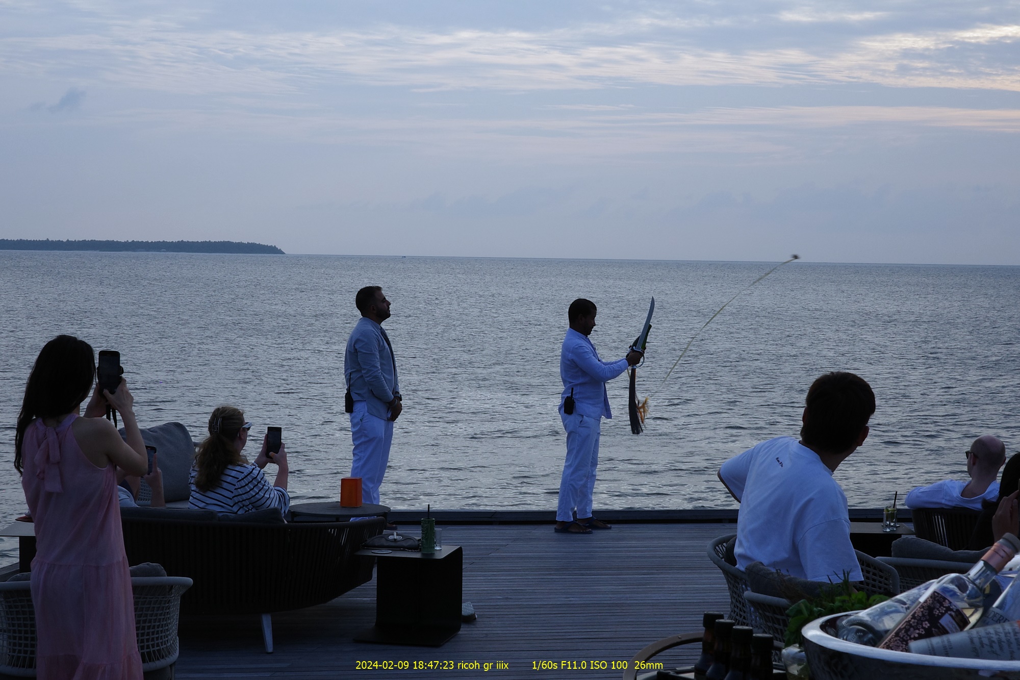 夕方になるとオープンテラスのバーに集合!これから刀でシャンパンの口を切るという儀式(Champagne Sabering)が行われる。これは2022年のランカウイ島のセントレジスでも見たことがある。